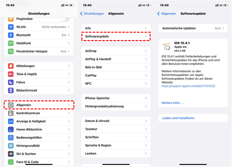 eSIM lässt sich nicht auf das neue iPhone übertragen? Das veraltete iOS unterstützt keine eSIM-Übertragung. Wenn Sie auf dem iPhone SIM in eSIM umwandeln möchten, ist ein notwendiges iOS-Update erforderlich. Sie können zu „Einstellungen“ > „Allgemein“ > „Softwareupdate“ gehen und auf „Laden und installieren“ tippen, um Ihr iPhone auf die neueste Version zu aktualisieren.