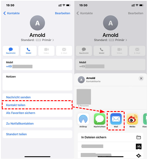 Schritt 2: Klicken Sie auf „Kontakt teilen“ > „E-Mail“.