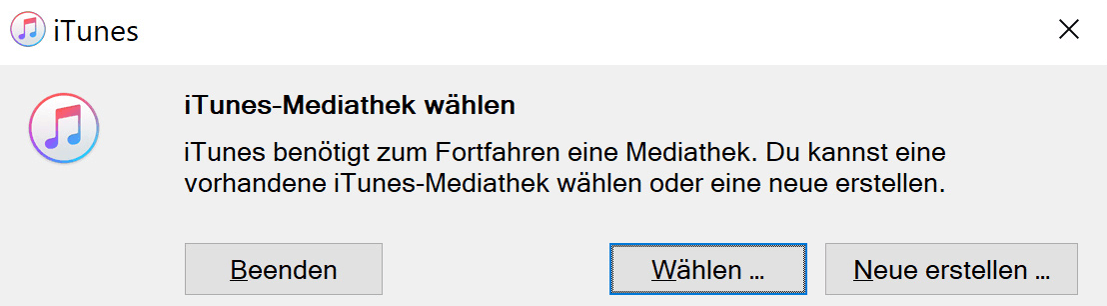 Schritt 1. Schließen Sie iTunes > Drücken Sie die Umschalttaste, während Sie iTunes neu starten > Halten Sie die Umschalttaste gedrückt, bis ein Dialogfeld angezeigt wird, in dem Sie aufgefordert werden, eine Bibliothek auszuwählen oder zu erstellen.