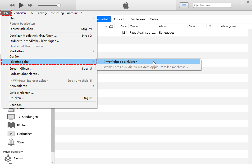 Weg 3. iTunes-Mediathek über die Home-Sharing-Funktion teilen