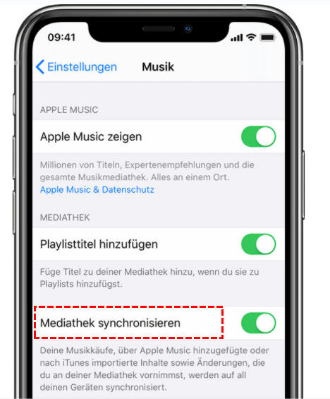 Die Einstellungen können sich nach der Softwareaktualisierung ändern. Gehen Sie zur App „Einstellungen“ und vergewissern Sie sich, dass Sie die Option „Mediathek synchronisieren“ auf dem iPhone aktiviert haben.