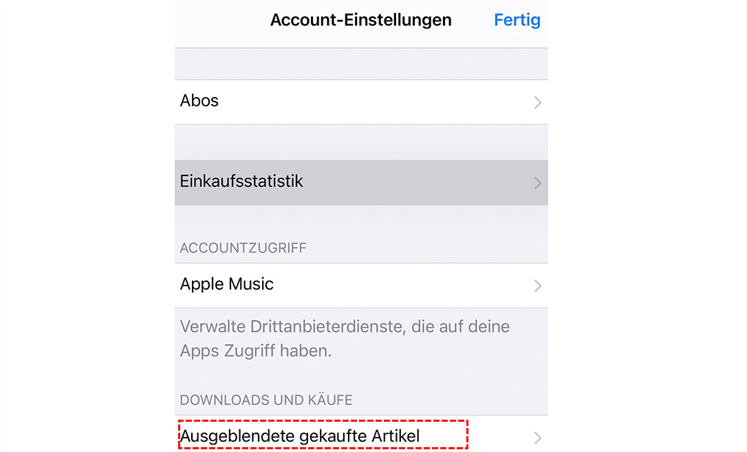 Gehen Sie zum iTunes Store > Wählen Sie einen Account und tippen Sie auf „Apple ID anzeigen“ > Geben Sie Ihren Passcode ein, wenn Sie dazu aufgefordert werden > Tippen Sie auf „Ausgeblendete gekaufte Artikel“ > Klicken Sie auf das Wolkensymbol neben dem Titel, um ihn wieder einzublenden.