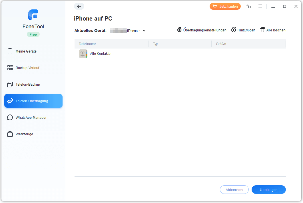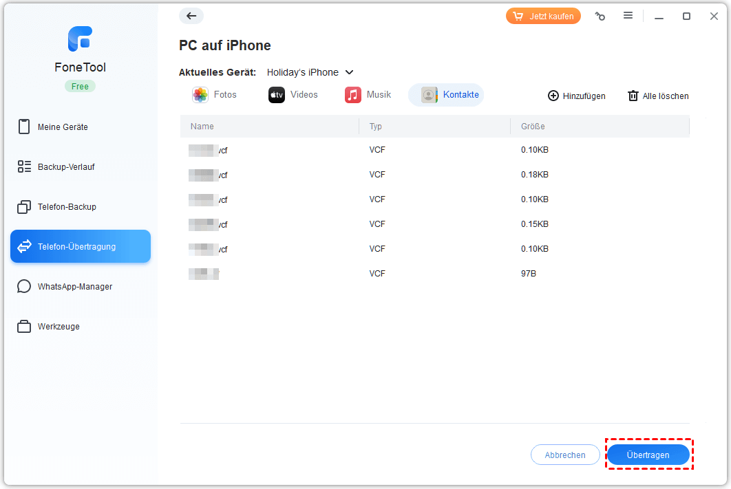 Wenn Sie Kontakte auf ein neues iPhone importieren möchten, gehen Sie bitte zu Telefon-Übertragung > PC auf iPhone, wählen Sie die exportierten Kontakte aus und klicken Sie auf Übertragung starten. Es werden keine vorhandenen Daten auf dem Gerät gelöscht.