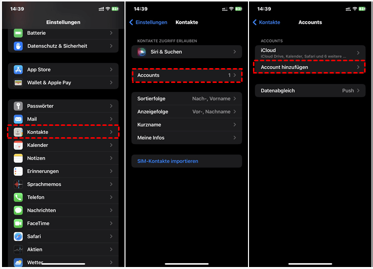 Mit „Auf iOS übertragen“ werden keine Kontakte übertragen? Wenn Sie Ihre Kontakte in einem E-Mail-Konto auf Ihrem Android-Gerät gespeichert haben, können Sie diese Kontakte mit dem iPhone synchronisieren, indem Sie das E-Mail-Konto auf Ihrem iPhone hinzufügen. Als Beispiel nehmen wir hier ein Google-Konto.