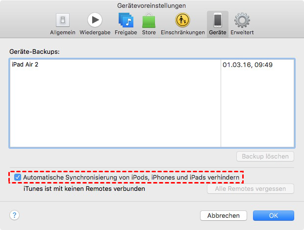 ► Öffnen Sie iTunes > Klicken Sie oben auf Bearbeiten > Wählen Sie Gerätevoreinstellungen > Gehen Sie zum Abschnitt Geräte. Entfernen Sie das Häkchen neben Automatische Synchronisierung von iPods, iPhones und iPads verhindern und klicken Sie auf OK, um Ihre Änderungen zu speichern.