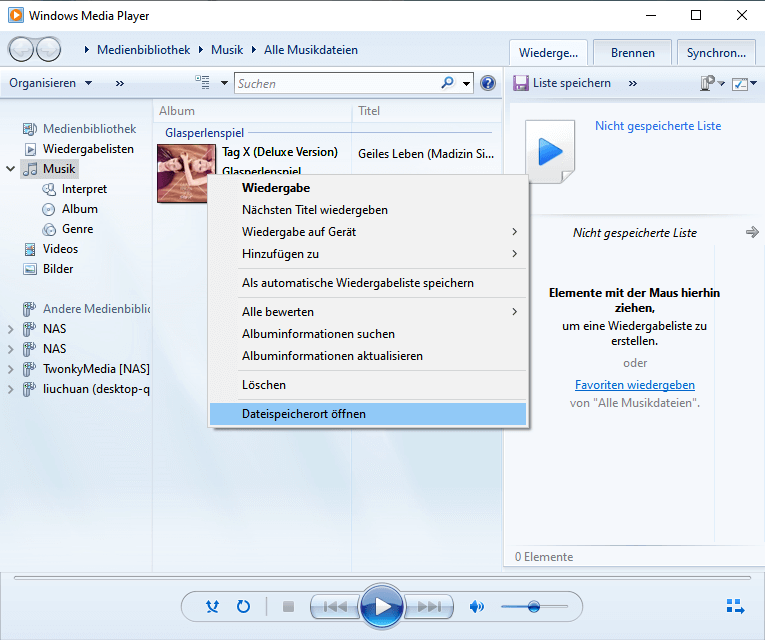Öffnen Sie Windows Media Player > Klicken Sie mit der rechten Maustaste auf einen Song > Wählen Sie Dateispeicherort öffnen, um den Speicherort Ihrer Songs herauszufinden.