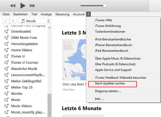 ▶ Starten Sie jetzt iTunes > klicken Sie in der Symbolleiste auf Hilfe > Nach Updates suchen > iTunes aktualisieren.