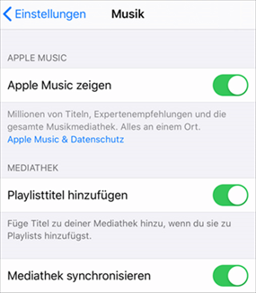 ▶ Gehen Sie auf Ihrem iPhone zu Einstellungen > Musik > Klicken Sie auf Mediathek synchronisieren.