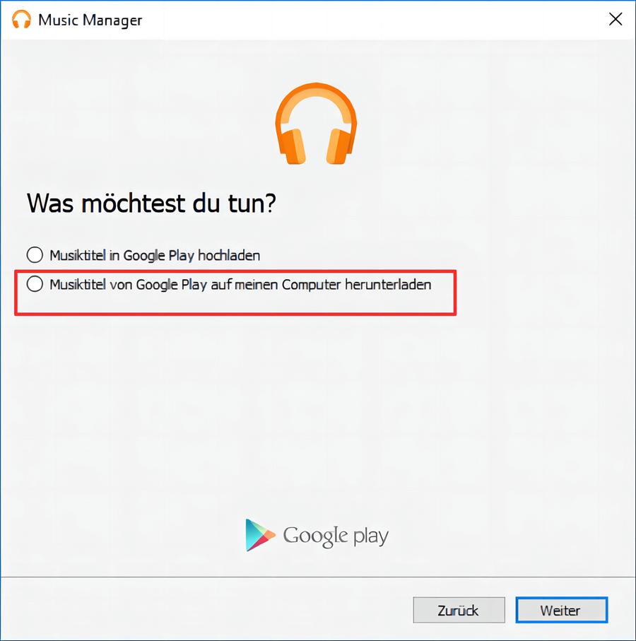 ★ Schritt 2. Wählen Sie die Option Musiktitle von Google Play auf meinen Computer herunterladen und wählen Sie die zu synchronisierenden Lieder auf dem Computer aus.