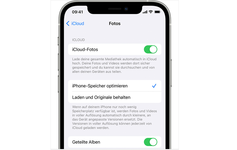 Gehen Sie zu: „Einstellungen“ > „[Ihr Name]“ > „iCloud“ > „Fotos“. Aktivieren Sie die Option „Laden und Originale behalten“. Und Sie können den Windows Explorer öffnen, um zu sehen, ob die verlorenen Bilder darin angezeigt werden.