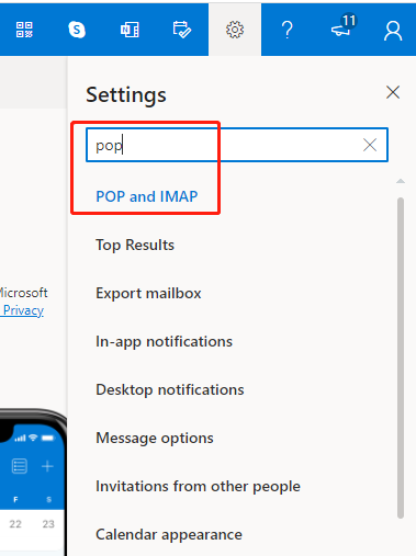 Schritt 1: Gehen Sie zu outlook.com, klicken Sie oben rechts auf „Einstellungen“, suchen Sie nach „Pop“ und tippen Sie auf „POP und IMAP“.