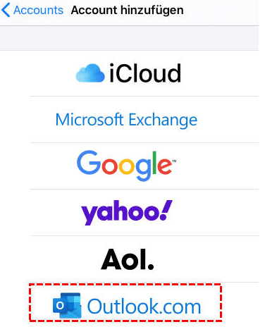 Schritt 1. Gehen Sie auf Ihrem iPhone zu Einstellungen > Suchen und wählen Sie Account & Passwörter > Tippen Sie auf Account hinzufügen > Wählen Sie die Option Outlook.com, um sich bei Ihrem Konto und Passwort anzumelden.