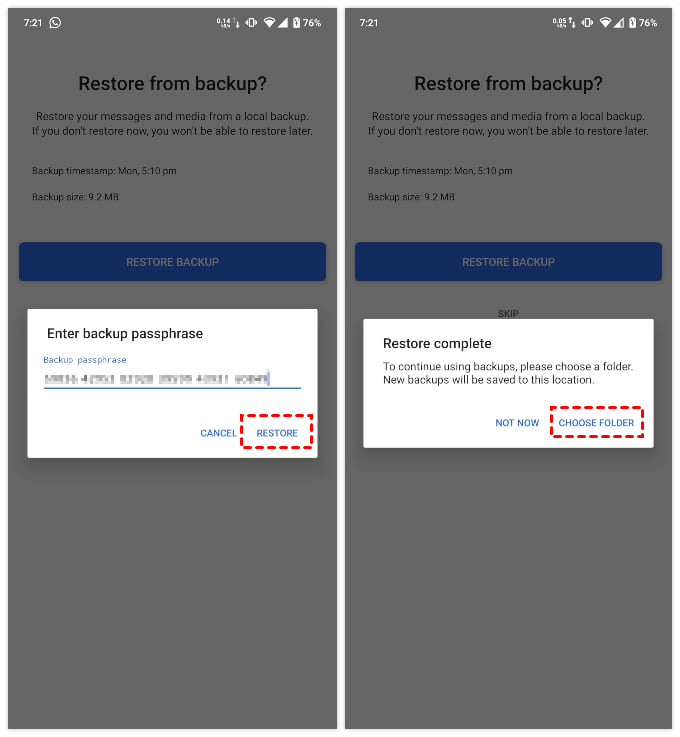 ▶ Schritt 6. Geben Sie Ihren 30-stelligen Passcode ein und klicken Sie auf Wiederherstellen. Klicken Sie dann auf FOLDER WÄHLEN, um diese Sicherung zu speichern.