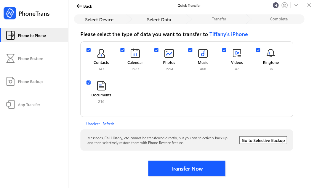 Schritt 2. Öffnen Sie PhoneTransfer und klicken Sie auf der Hauptoberfläche auf Phone to Phone > Wählen Sie Quick Transfer.