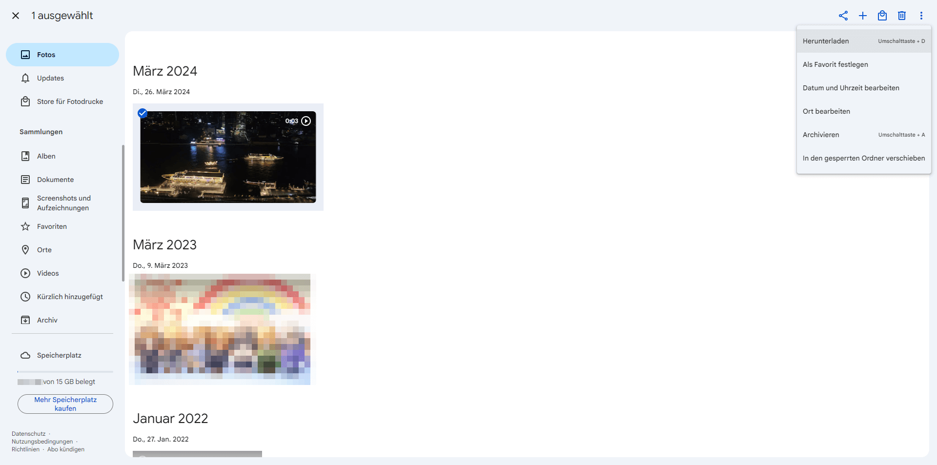 Schritt 2: Computer: https://photos.google.com/ aufrufen und mit demselben Konto anmelden > Die hochgeladenen Fotos auswählen > Auf die Schaltfläche mit den drei Punkten oben rechts klicken > „Herunterladen“ anklicken, um das Video von iPhone auf PC ohne USB-Kabel zu übertragen.
