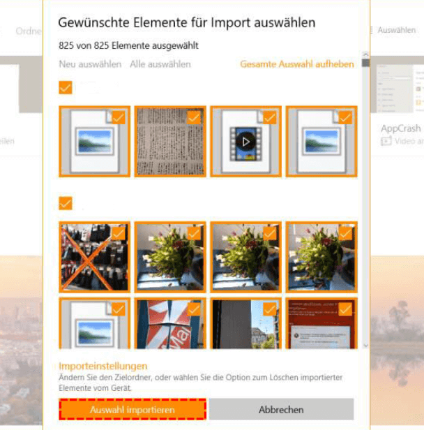 Schritt 3. Deaktivieren Sie die Fotos, die Sie auf den Computer übertragen möchten > Klicken Sie auf „Einstellungen importieren“, um den Zielordner auszuwählen oder importierte Elemente von Ihrem Gerät zu löschen.