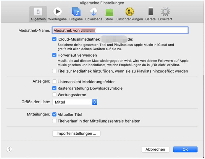 Klicken Sie in iTunes auf „Bearbeiten“ > „Einstellungen“ > Wählen Sie im Eingabeaufforderungsfenster „Allgemein“ > Aktivieren Sie das Kontrollkästchen neben „iCloud-Musikmediathek“ > Klicken Sie zur Bestätigung auf „OK“.