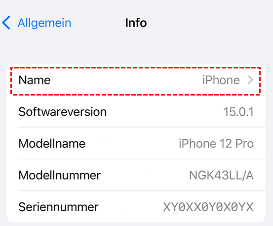 Um den AirDrop-Namen zu ändern, gehen Sie zu Einstellungen > Allgemein > Info > Name. Geben Sie den gewünschten Namen ein. Tippen Sie auf Fertig, um die Änderung zu bestätigen.