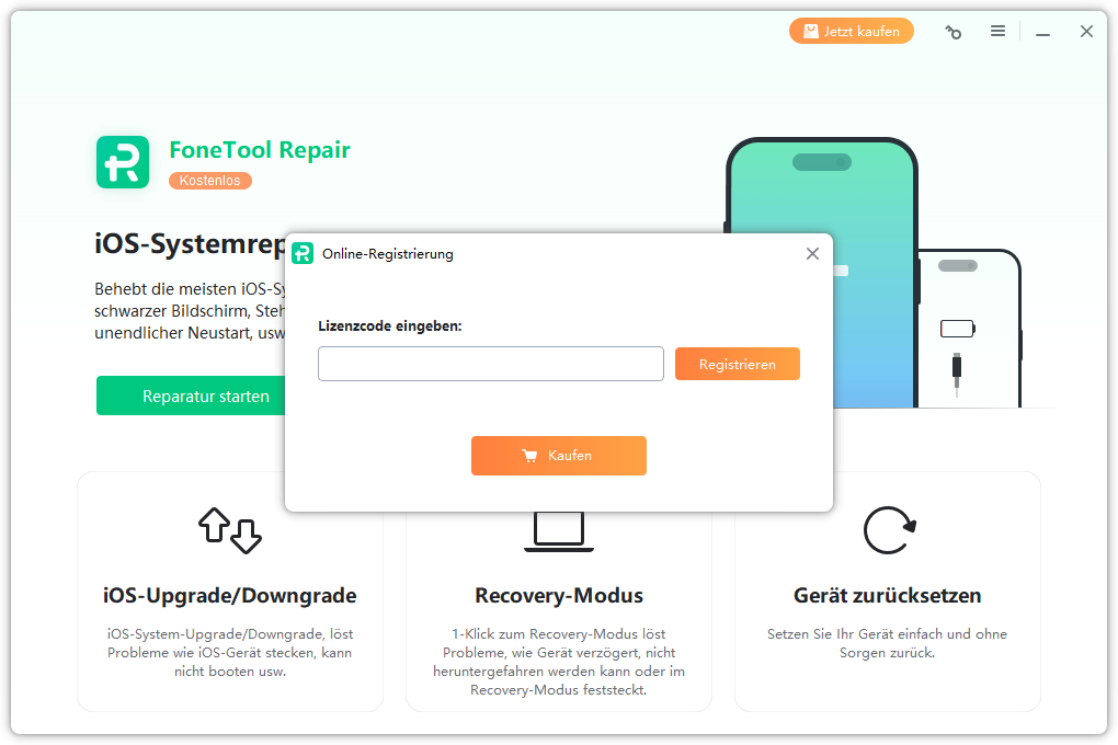 Schritt 1: Um FoneTool Repair zu starten, wird ein Registrierungsfenster angezeigt. Sollte das Fenster nicht angezeigt oder versehentlich geschlossen werden, können Sie auch auf „Menü“ > „Registrieren“ oder auf das Schlüsselsymbol oben rechts klicken.