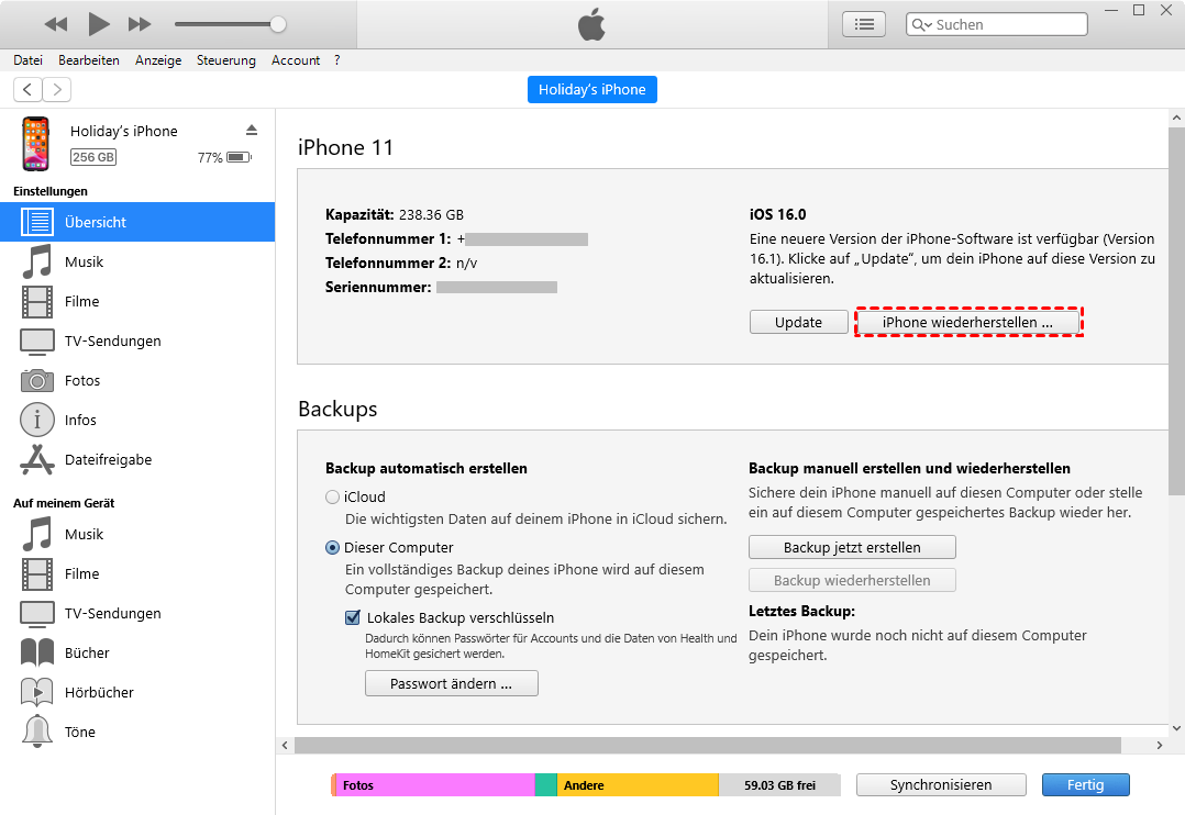 Wenn Sie keinen Zugriff über die Apple-ID haben und der Bildschirmzeit-Code nicht bekannt ist, bleibt als letzte Möglichkeit nur das Zurücksetzen des Geräts auf Werkseinstellungen ohne Wiederherstellung aus einem verschlüsselten Backup.