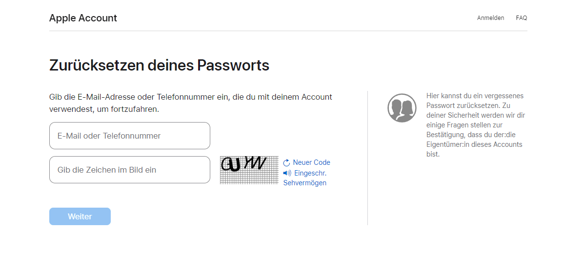 Wenn Sie die Apple-ID nicht mehr kennen oder Ihr iPhone gesperrt ist, können Sie den Apple-Support kontaktieren. Apple bietet einen Kundendienst, der Ihnen bei der Wiederherstellung Ihrer Apple-ID oder der Entsperrung Ihres iPhones helfen kann. Allerdings kann dies lange dauern, und es ist keine Garantie, dass Sie Ihr Gerät schnell zurückbekommen.