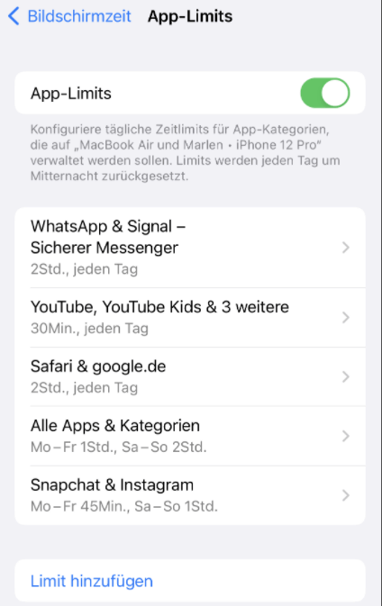 2. Tippen Sie auf App-Limits → Limit hinzufügen.