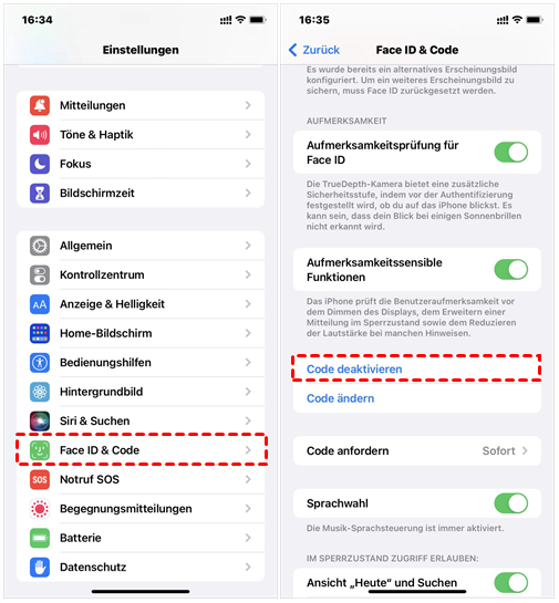 Weg 1. iPhone Bildschirmsperre deaktivieren über Einstellungen