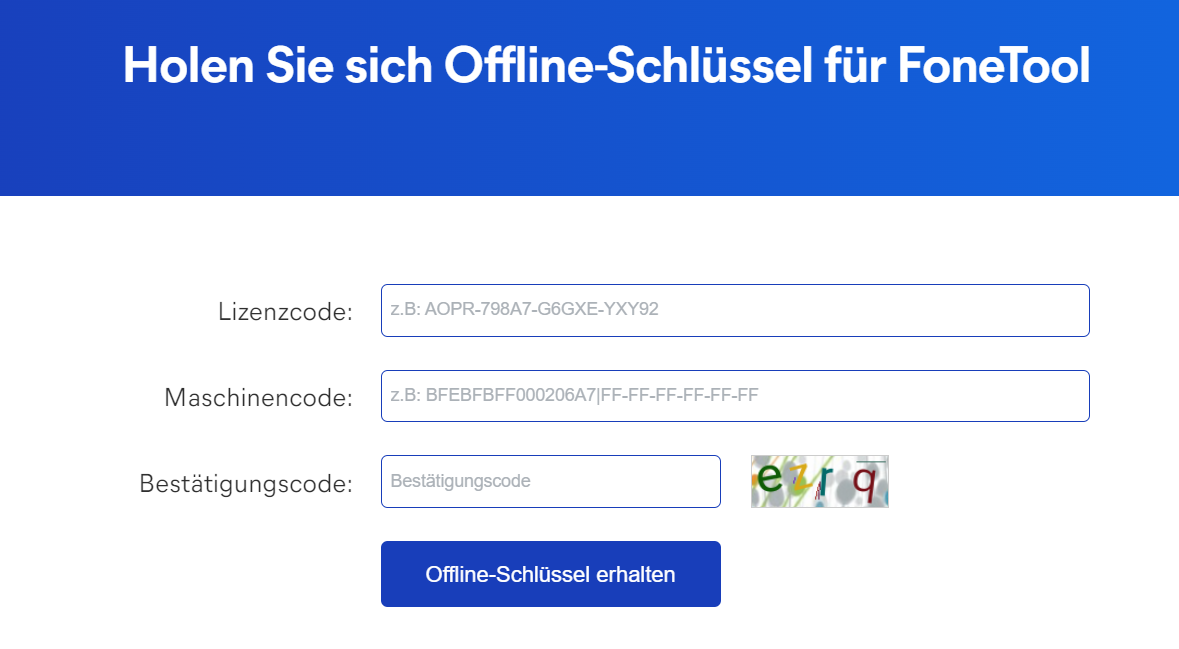 Schritt 2. Geben Sie Ihren Lizenzcode und Ihren Maschinencode (kopieren Sie ihn aus dem Offline-Registrierungsfenster) auf der sich öffnenden Webseite ein, um einen Offline-Schlüssel zu erhalten.