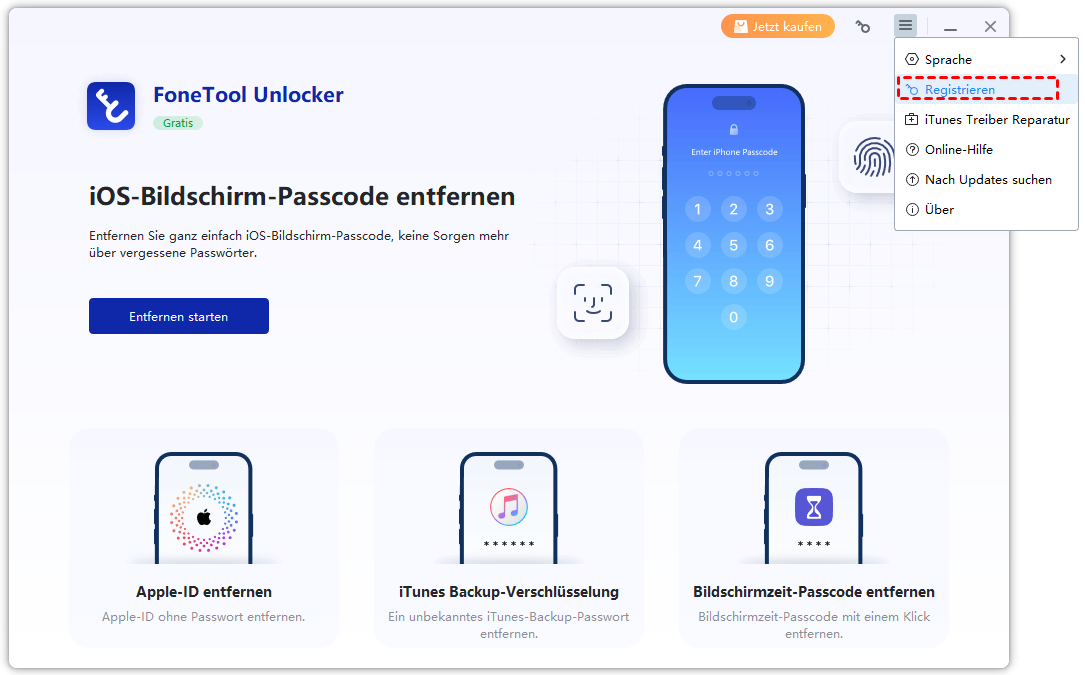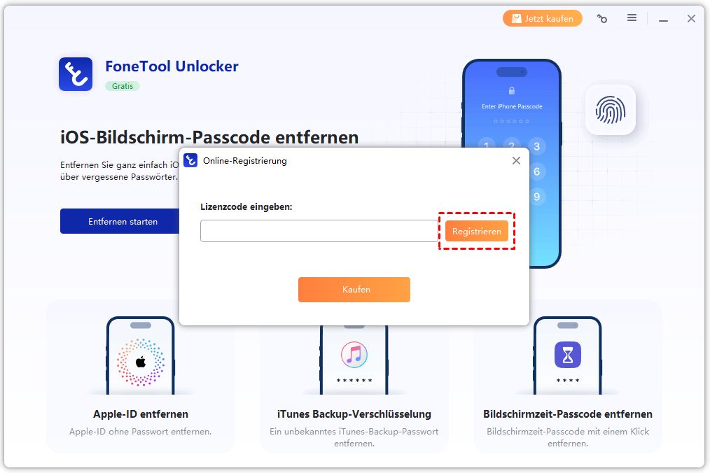 Schritt 1. Starten Sie FoneTool Unlocker. Es wird ein Registrierungs-Popup-Fenster angezeigt. Wenn Sie das Popup-Fenster nicht sehen oder es versehentlich schließen, können Sie auch auf die Schaltfläche „Menü“ > „Registrieren“ oder auf das Schlüsselsymbol in der oberen rechten Ecke klicken.