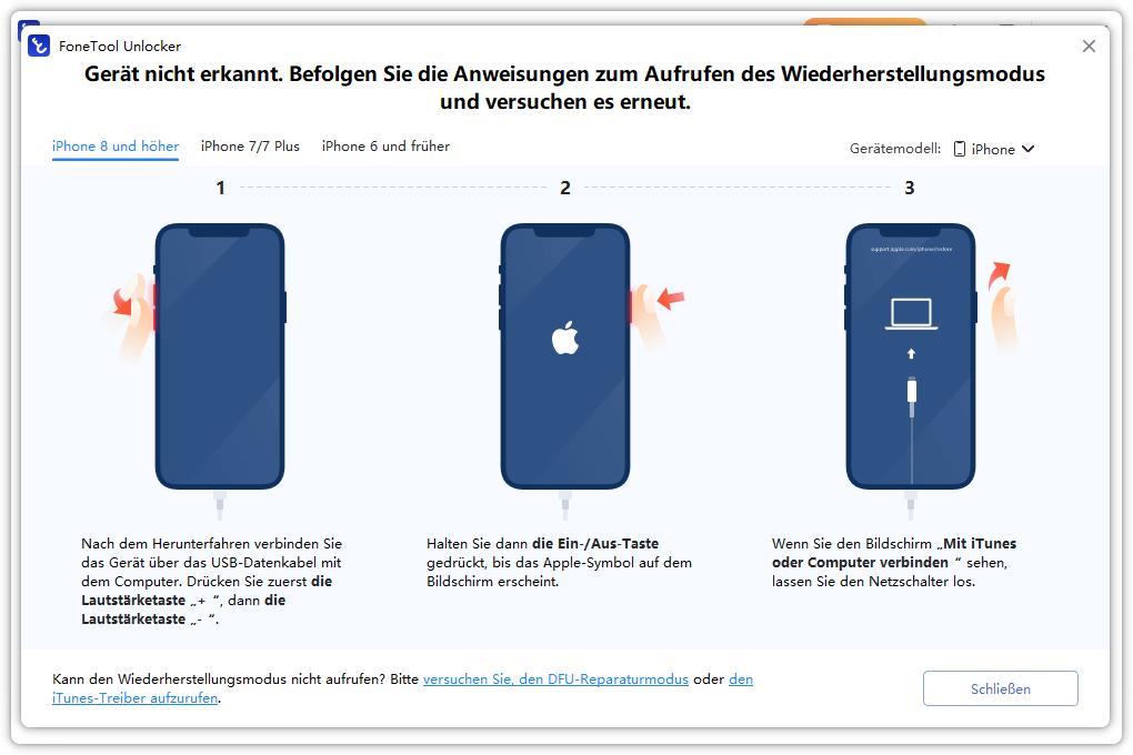 Wenn Ihr iPhone, iPad oder iPod Touch auch nach mehreren Verbindungsversuchen nicht von Ihrem Computer oder FoneTool Unlocker erkannt wird, hilft Ihnen diese Anleitung, die möglichen Ursachen zu verstehen und Schritte zur Lösung des Problems bereitzustellen.