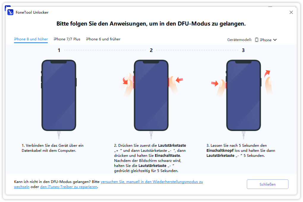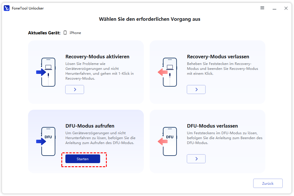 Zusammenfassend bietet der Wiederherstellungs-/DFU-Modus eine schnelle und zuverlässige Möglichkeit, Probleme wie das Einfrieren des Geräts, das Nicht-Ausschalten oder das Feststecken im Wiederherstellungsmodus zu beheben. Ohne eine vollständige Systemreparatur zu benötigen, können Benutzer diese Modi einfach aktivieren oder deaktivieren. Dies macht sie zu einer sicheren und effizienten Lösung für dringende iOS-Probleme.