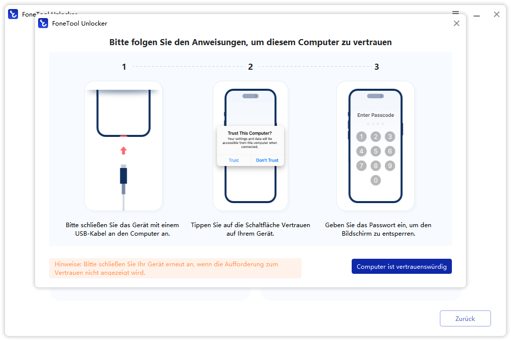 Schritt 3. Wenn Ihr iOS-Gerät mit dem Computer verbunden ist, der Bildschirm aber gesperrt ist, erscheint folgende Meldung: