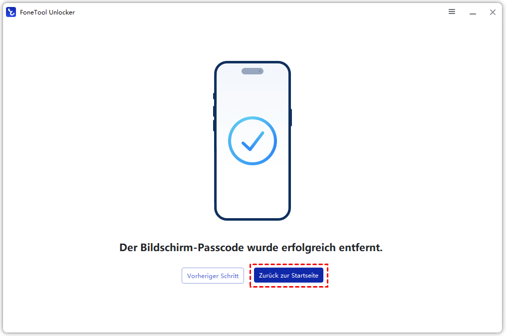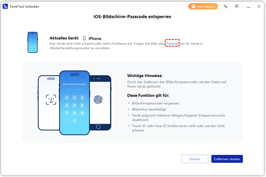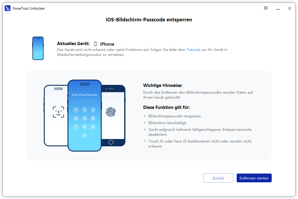Sie haben Ihren Bildschirm-Passcode für Ihr iPhone oder iPad vergessen? Mit FoneTool Unlocker können Sie Bildschirm-Passcodes entfernen, darunter 4- und 6-stellige Codes, Touch ID und Face ID. Beachten Sie, dass bei Verwendung dieser Funktion alle Daten auf Ihrem Gerät gelöscht werden.