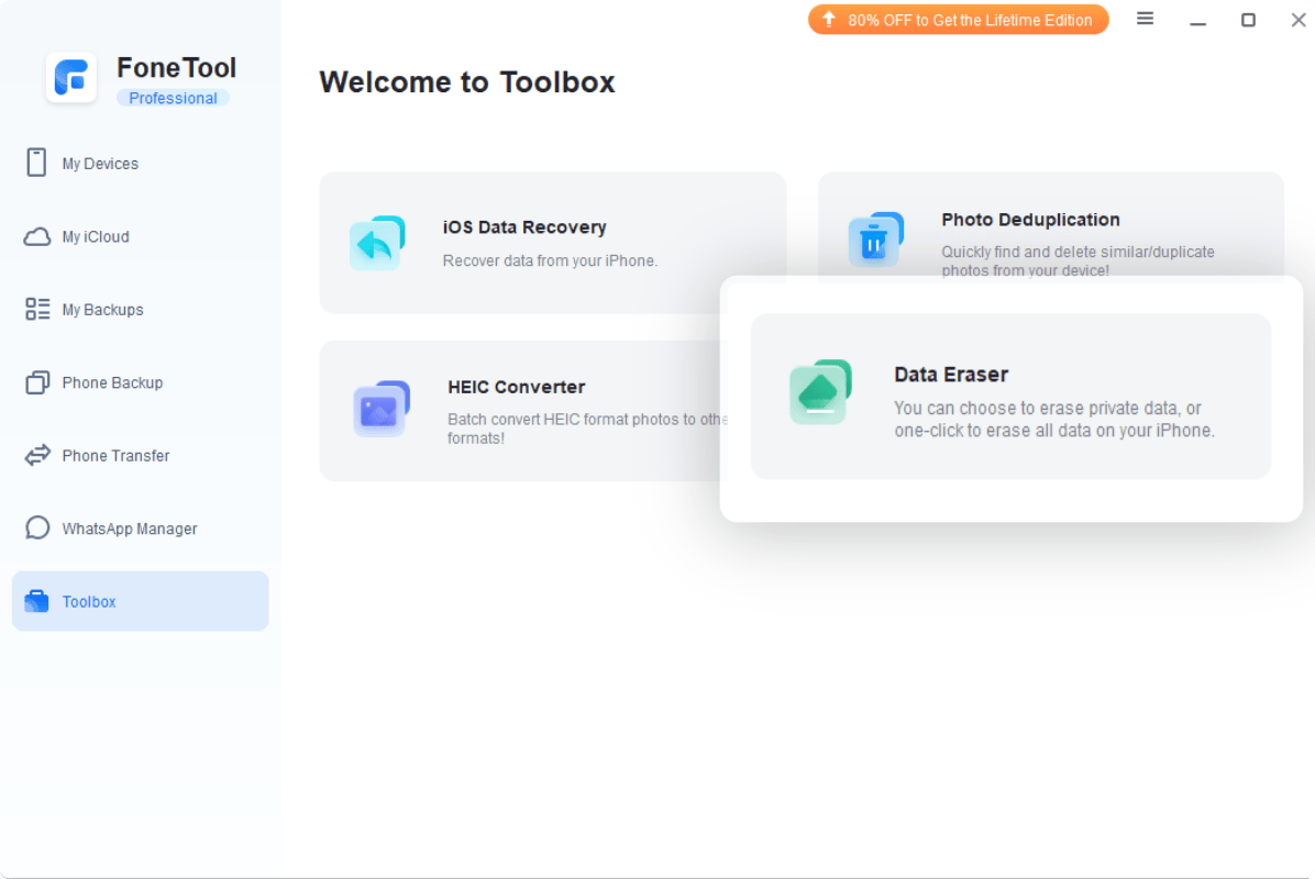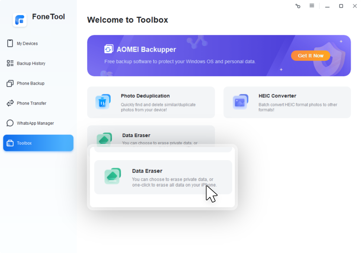 Connect iPhone to PC. Go to Toolbox > Choose Data Eraser.