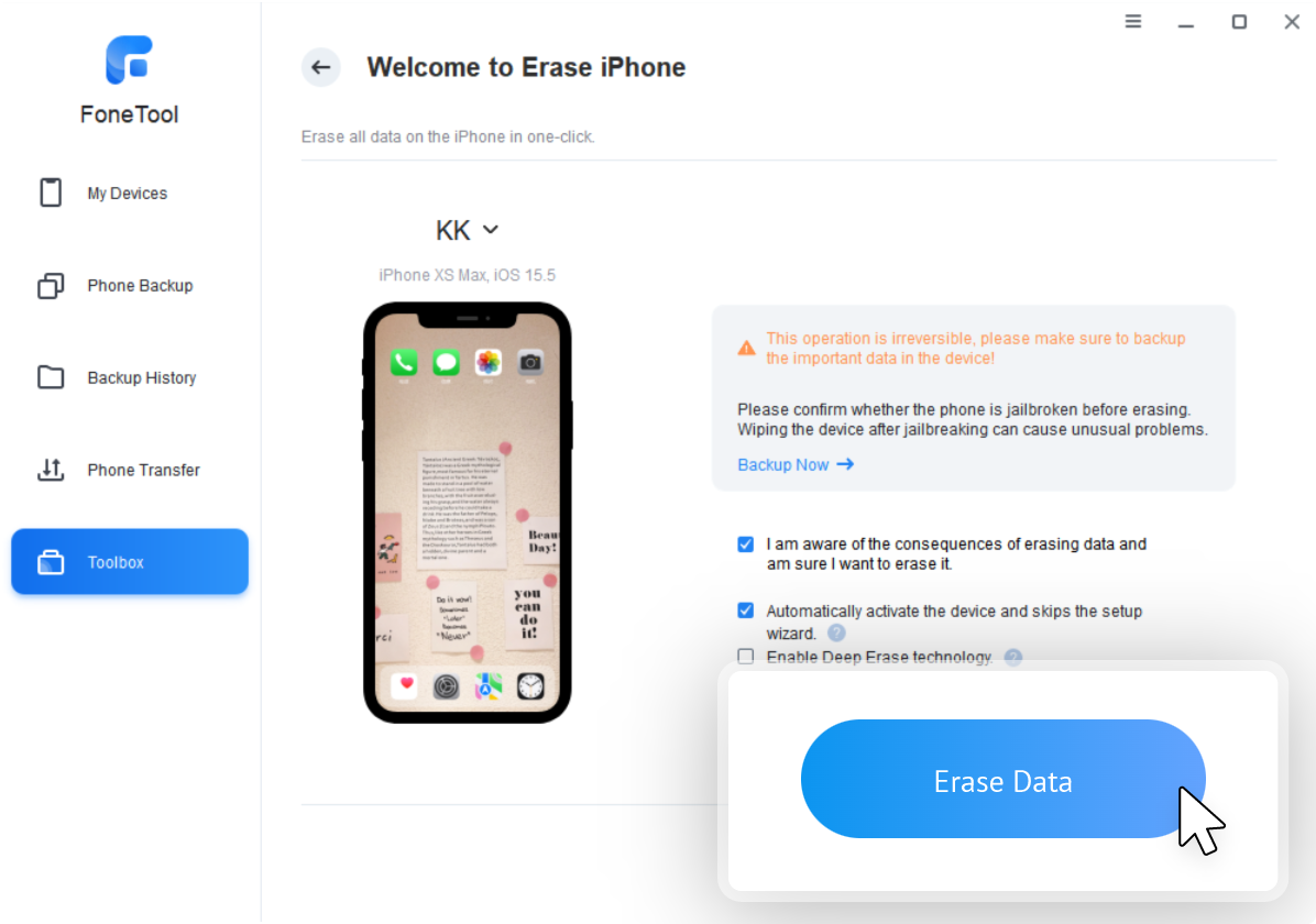 FoneTool has a user-friendly interface and step-by-step wizard, which can complete the process of erasing iPhone without password in 3 steps, which is easy for computer novices.