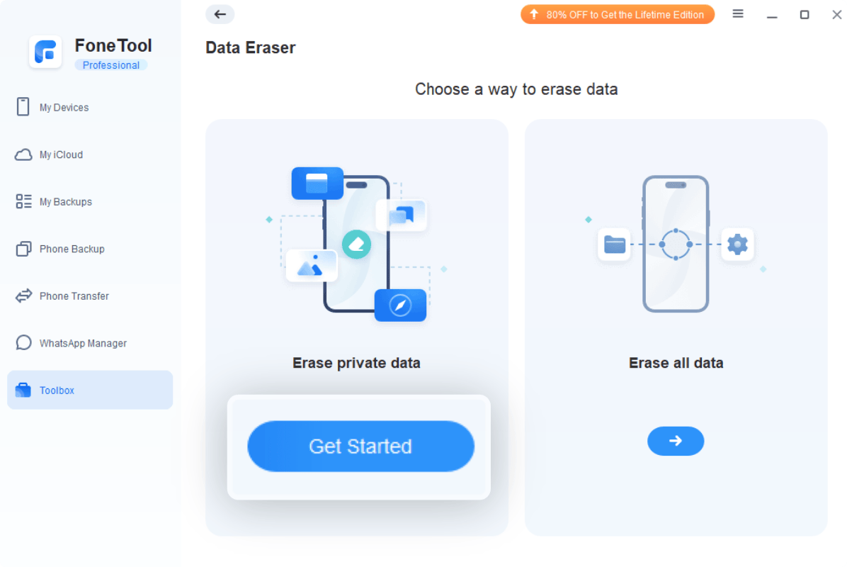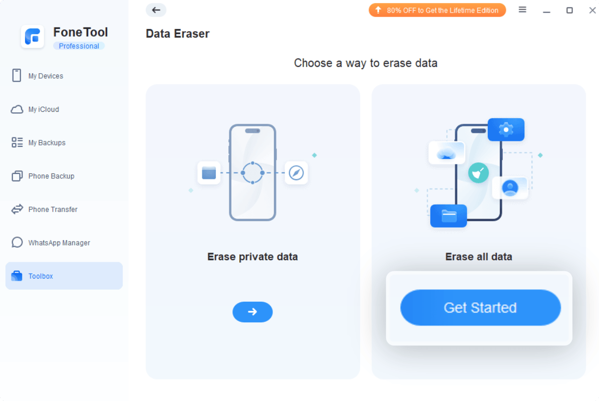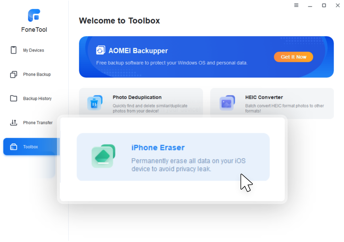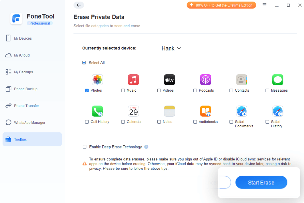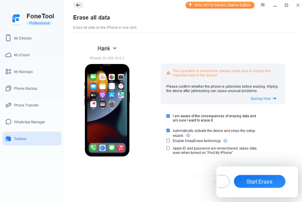 FoneTool offers DeepErase tech to completely and permanently erase all content or selected data. It is better enabled when you sell or give away your iPhone.