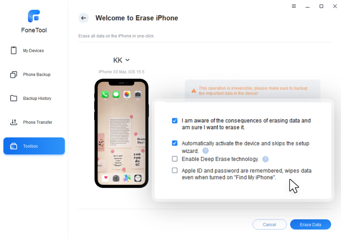 FoneTool adapts to various demands. For example, You can choose to factory reset iPhone or completely wipe data. And decide whether to keep Apple ID after deletion.