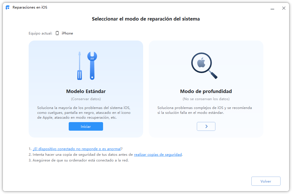 Paso 2. FoneTool Repair ofrece dos modos para solucionar el problema de iPhone no se puede activar: Modo Estándar y Modo de profundidad. Lea atentamente las notas antes de solucionarlo. Seleccione un modo de reparación, tenga en cuenta que la reparación estándar no perderá ningún dato.