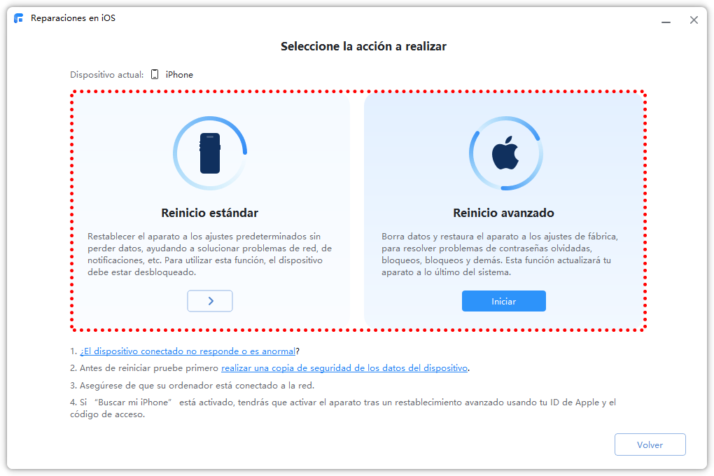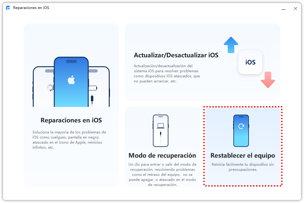 Paso 1. Para restaurar un iPhone con rapidez, haz clic en Restablecer el equipo. Esta herramienta te permite reinicia fácilmente tu iPhone.