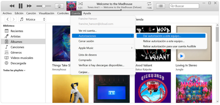 Paso 2. Vaya al menú itunes, haga clic en la cuenta y luego haga clic en autorización.