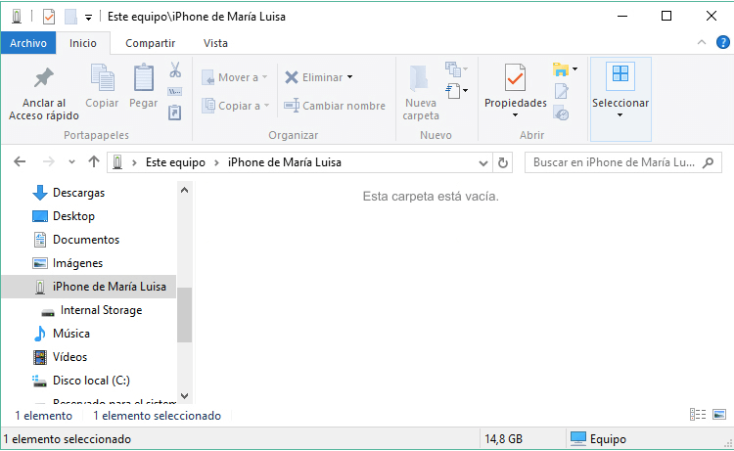 Cuando se conecta a Windows 10, la carpeta de almacenamiento interna del iPhone está vacía