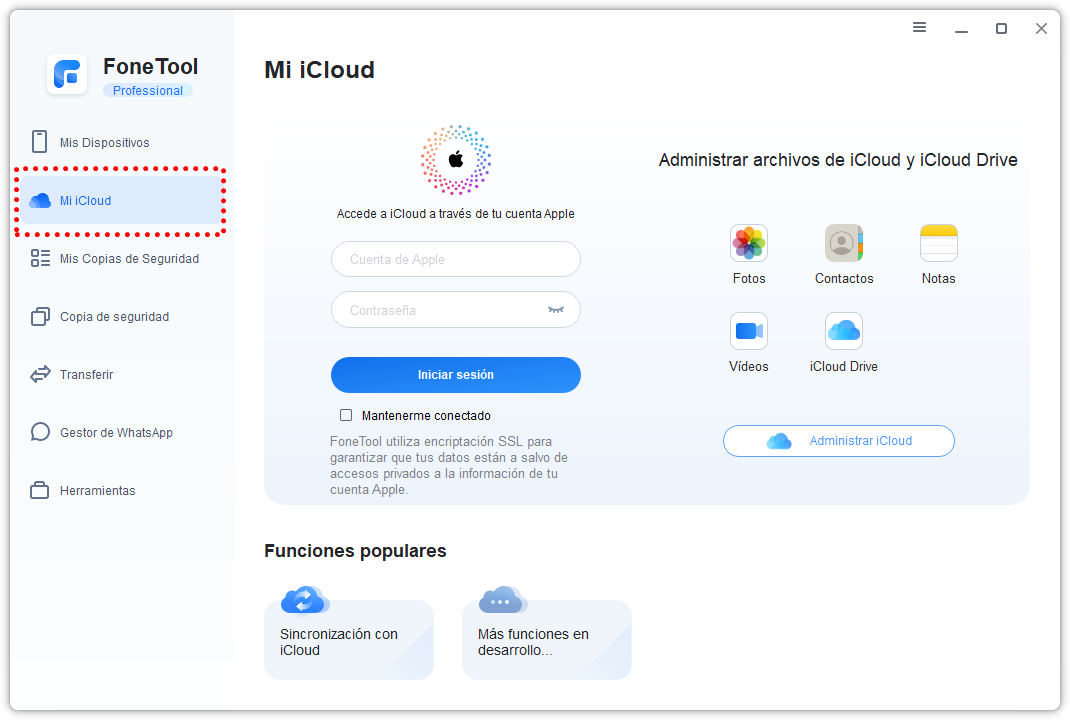 En la parte Mi iCloud, puedes acceder a iCloud a través de tu cuenta Apple para administrar los archivos con facilidad, incluye fotos, contactos, notas, videos, etc.