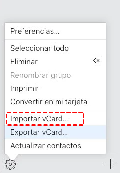 3. Haga clic en el botón Configuración > Elija Importar vCard... > Seleccione el archivo VCF de su computadora y cárguelo en iCloud.