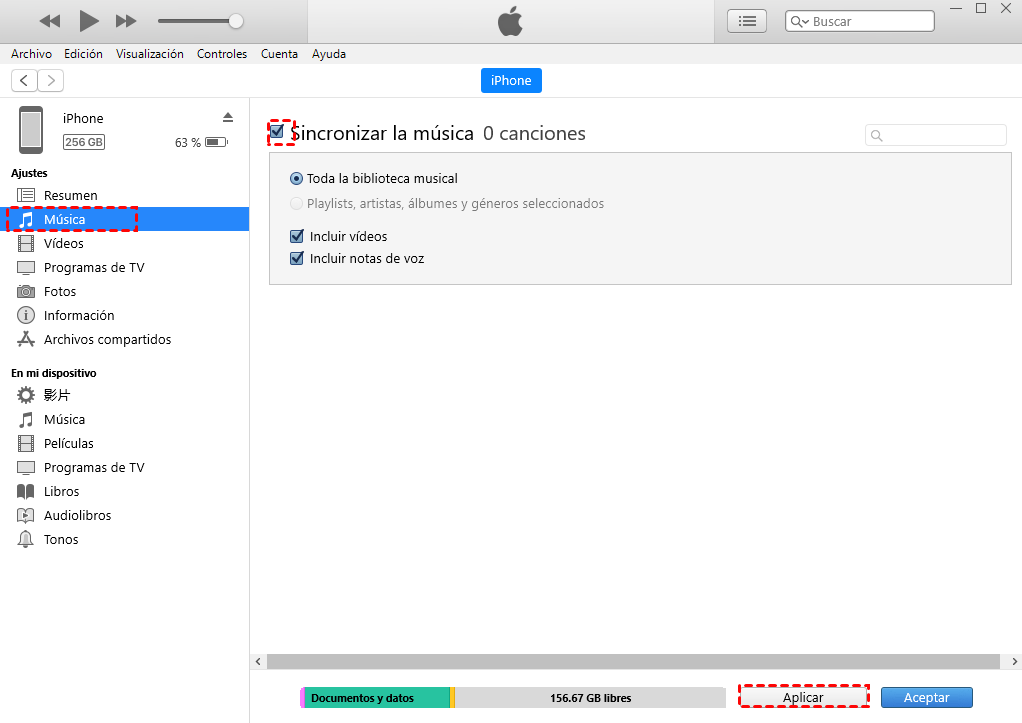4. Marque Sincronizar música > Decida las canciones que desea sincronizar > Haga clic en Aplicar para comenzar a copiar archivos de la PC al iPad.