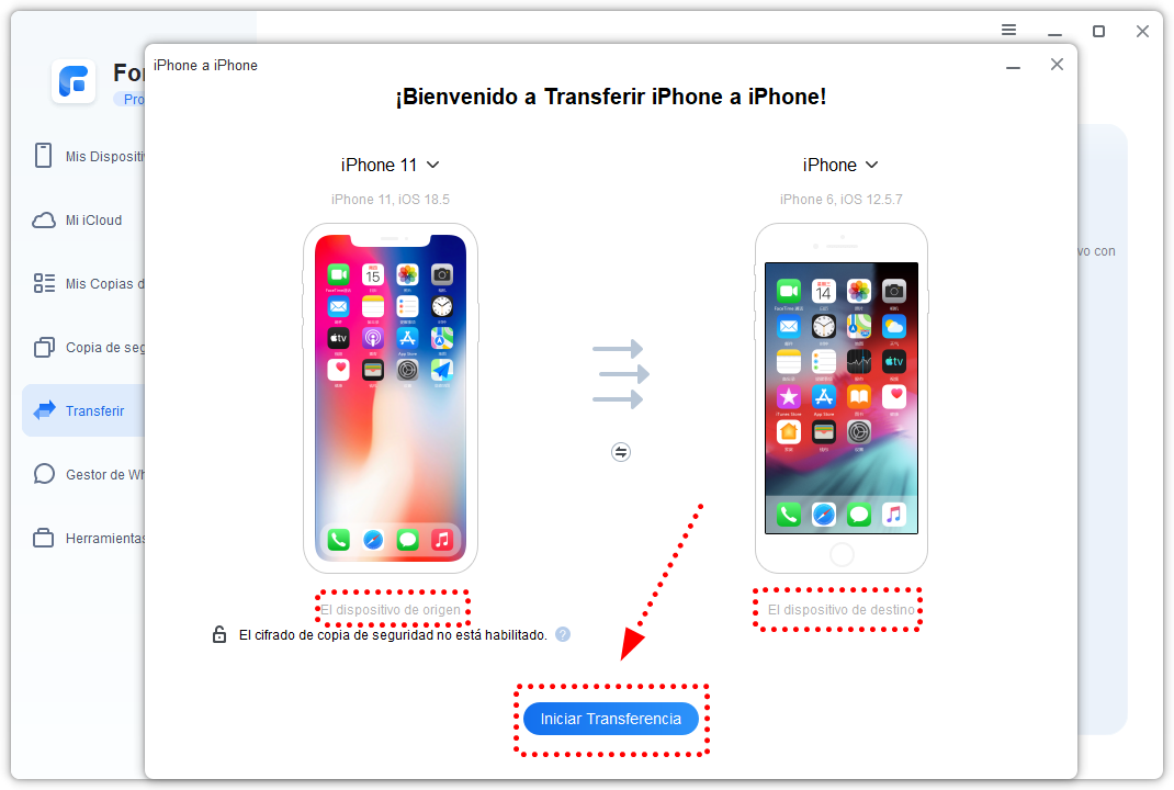 Paso 3. Selecciona un iPhone como dispositivo de origen, y otro iPhone nuevo como dispositivo de destino. Luego haz clic en Iniciar Transferiencia para pasar datos de un iPhone a otro.