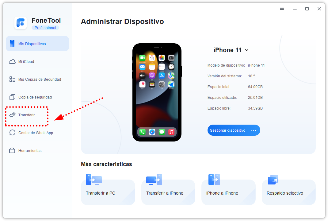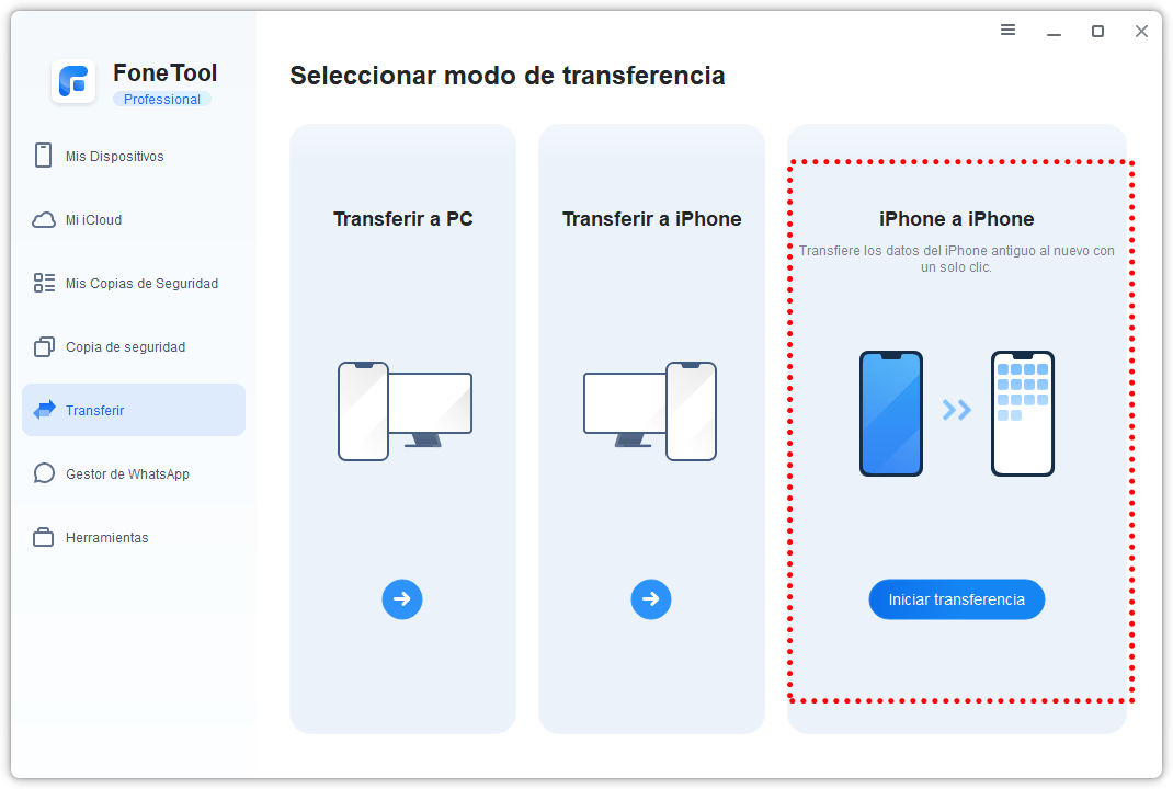 Paso 1. Conecta ambos iPhones a la computadora mediante cables USB. Abre FoneTool y selecciona la opción "Transferir".
