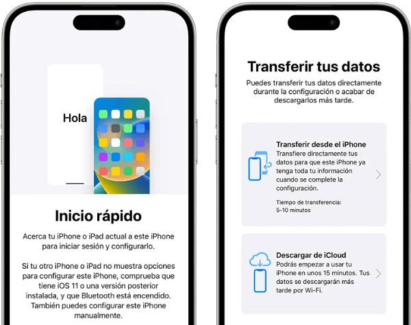 Para pasar datos de un iPhone a otro, una de las formas más fáciles y rápidas es mediante la función "Inicio rápido" de Apple. Esta opción aparece automáticamente cuando enciendes tu nuevo iPhone cerca del antiguo, y permite transferir toda la información de forma inalámbrica, incluyendo Apps, fotos, configuraciones, cuentas y más.