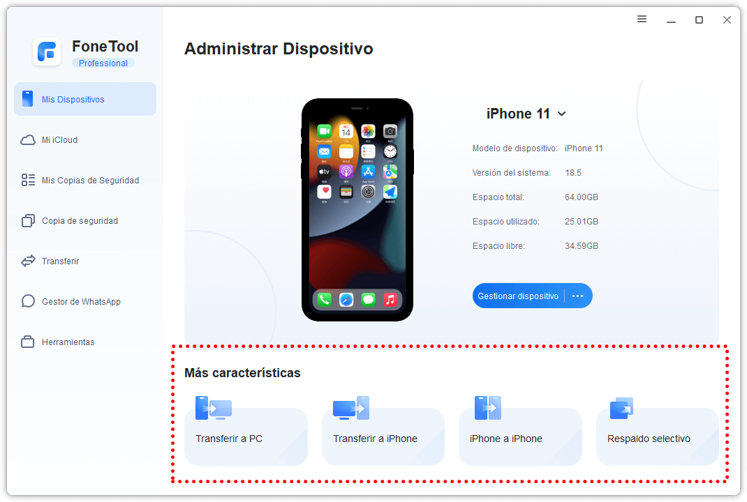 Paso 1. Instala y abre FoneTool. Conecta el iPhone al PC Windows con un cable USB. Una vez que el iPhone y la computadora estén conectados correctamente, FoneTool reconocerá automáticamente la información del iPhone. Hay cuatro herramientas a continuación, seleccione la primera: Transferir a PC.