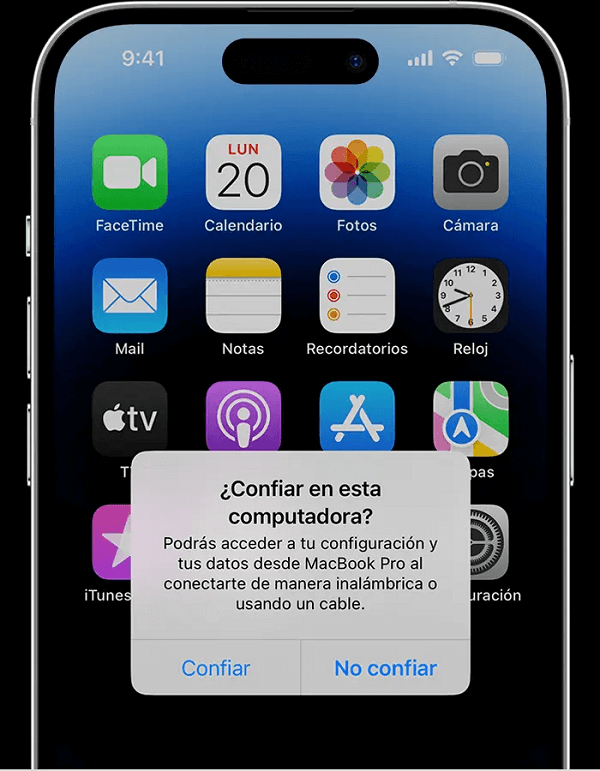 Paso 2. En el iPhone, aparecerá un mensaje preguntando si confías en el ordenador. Toca "Confiar" y, si es necesario, introduce tu código de desbloqueo.