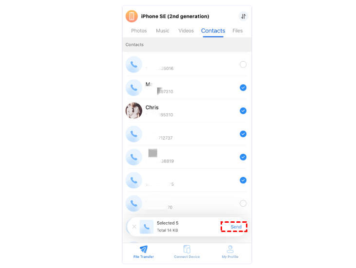 4. . Vaya a Transferencia de archivos > Elija los archivos que desea transferir > Toque Enviar para comenzar.